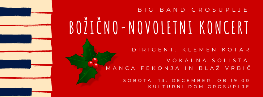 Koncert13.12.2025 | 19:00Kulturni dom GrosupljeTradicionalni božično-novoletni koncert Big banda GrosupljeKot feniks iz pepela (in le s kakim perescem manj na glavah) bo Big band Grosuplje pod taktirko Klemna Kotarja…