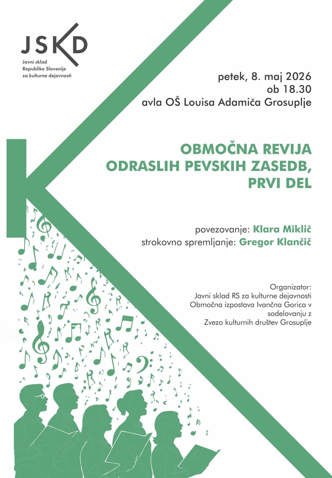 Vljudno vabljeni na Območno revijo odraslih pevskih zasedb – prvi del, ki bo v petek, 8. maja 2026, ob 18.30 uri v avli Osnovne šole Louisa Adamiča Grosuplje.